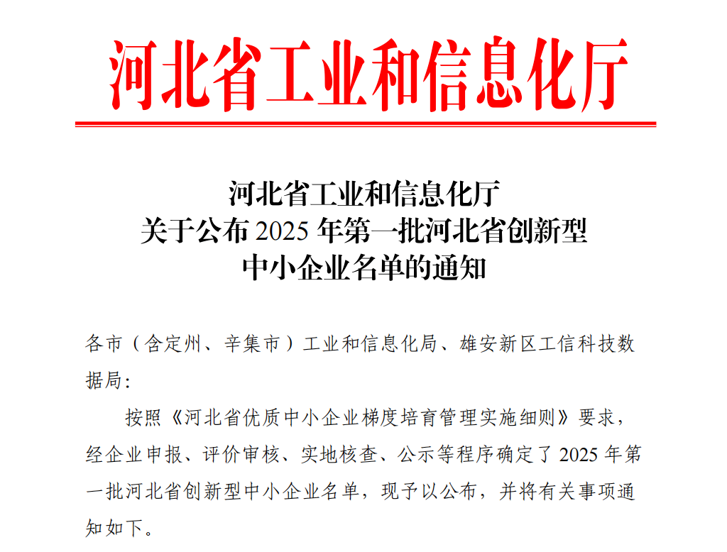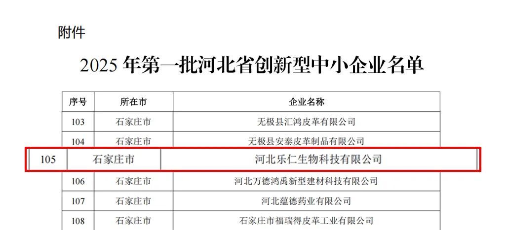 近日,河北省工业和信息化厅发文公布,2025年第一批河北省创新型中小企业名单,河北乐仁生物科技有限公司榜上有名!