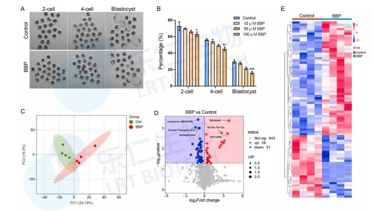 1. 发育停滞:100μM BBP处理下,胚胎囊胚形成率从29.8%暴跌至16.1%!