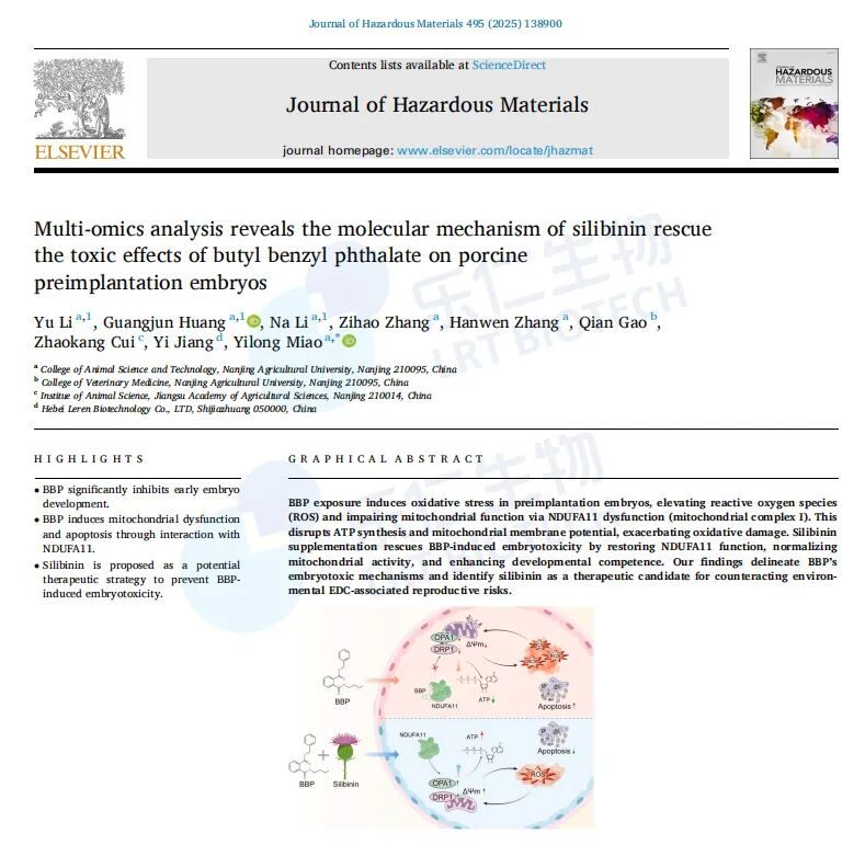 近日,南京农业大学苗义龙教授团队联合河北乐仁生物蒋毅博士在国际权威期刊Journal of Hazardous Materials在线发表了题为“Multi-omics analysis reveals the molecular mechanism of silibinin rescue the toxic effects of butyl benzyl phthalate on porcine preimplantation embryos”的重要研究成果。